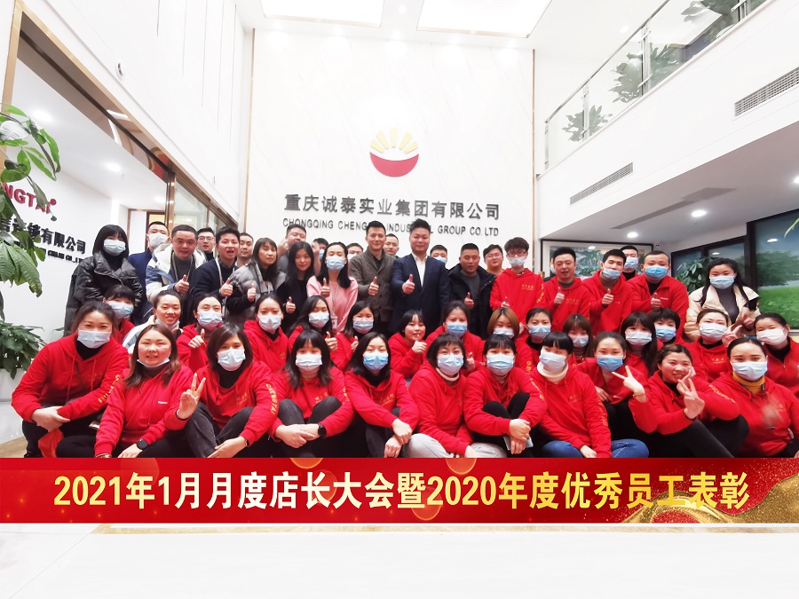 超越自我 追求卓越 2021年1月月度店长大会暨2020年度优秀员工表彰在集团会议室隆重举行全员合影区域经理领奖军令状优秀店长、员...