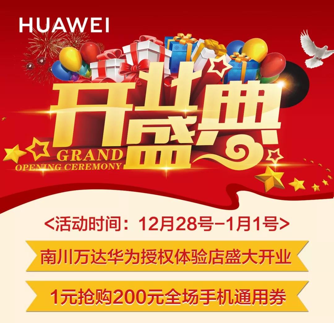 诚泰通信南川万达华为体验店12月28日—1月1日盛大开业手机、礼品、福利拿到手软!路人都能领好礼~更有1元抢购200元全场手机通用券,老板得多任性?路过不进去看看么?只要你...