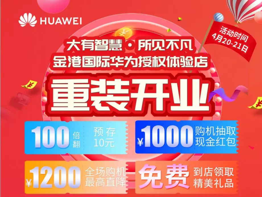 4月20日—21日重庆诚泰通信渝北金港国际华为授权体验店重装开业啦优惠多多!福利多多!4月20日—21日渝北金港国际华为授权体验店重装开业咨询热线:18581215617地址:渝北区...