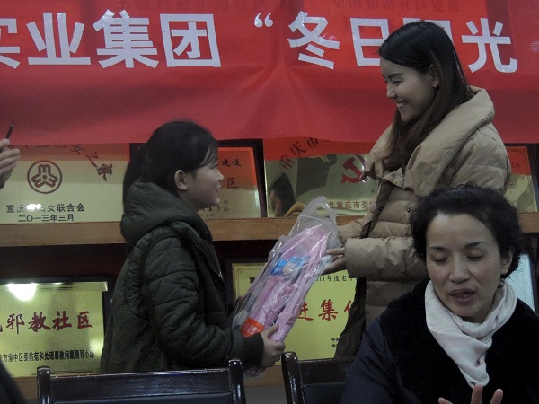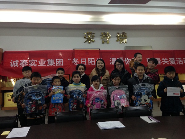 2014年1月3日下午,诚泰实业集团携手大溪沟街道人和街社区举办了“冬日阳光·温暖你我”活动。为人和街市民学校10位贫困学生送去了书包、文具、书籍等学习物品及爱心捐助款,同时也送去了冬日里的一片暖流。